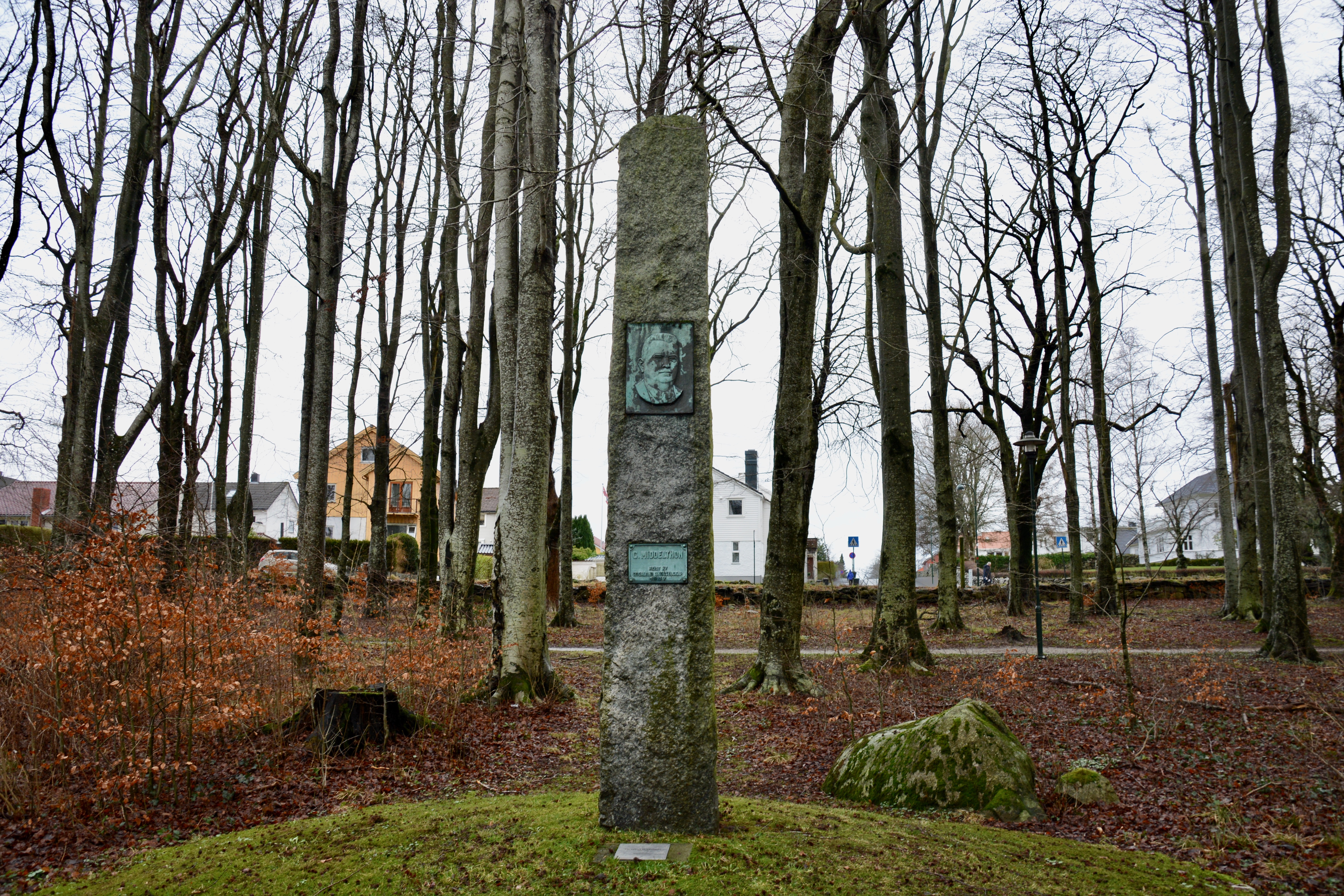 Cornelius Middelthon var stortingsmann for Høyre i to perioder og tre regjeringer fra 1919-1924. Middelthon var også sterkt engasjert i skogsaken og var med i Stavanger Skogselskap fra det ble etablert i 1899. Han var deretter formann fra 1911 til sin død i 1934. Bysten ble reist i hans minne av Rogaland Skogselskap, som det da het.