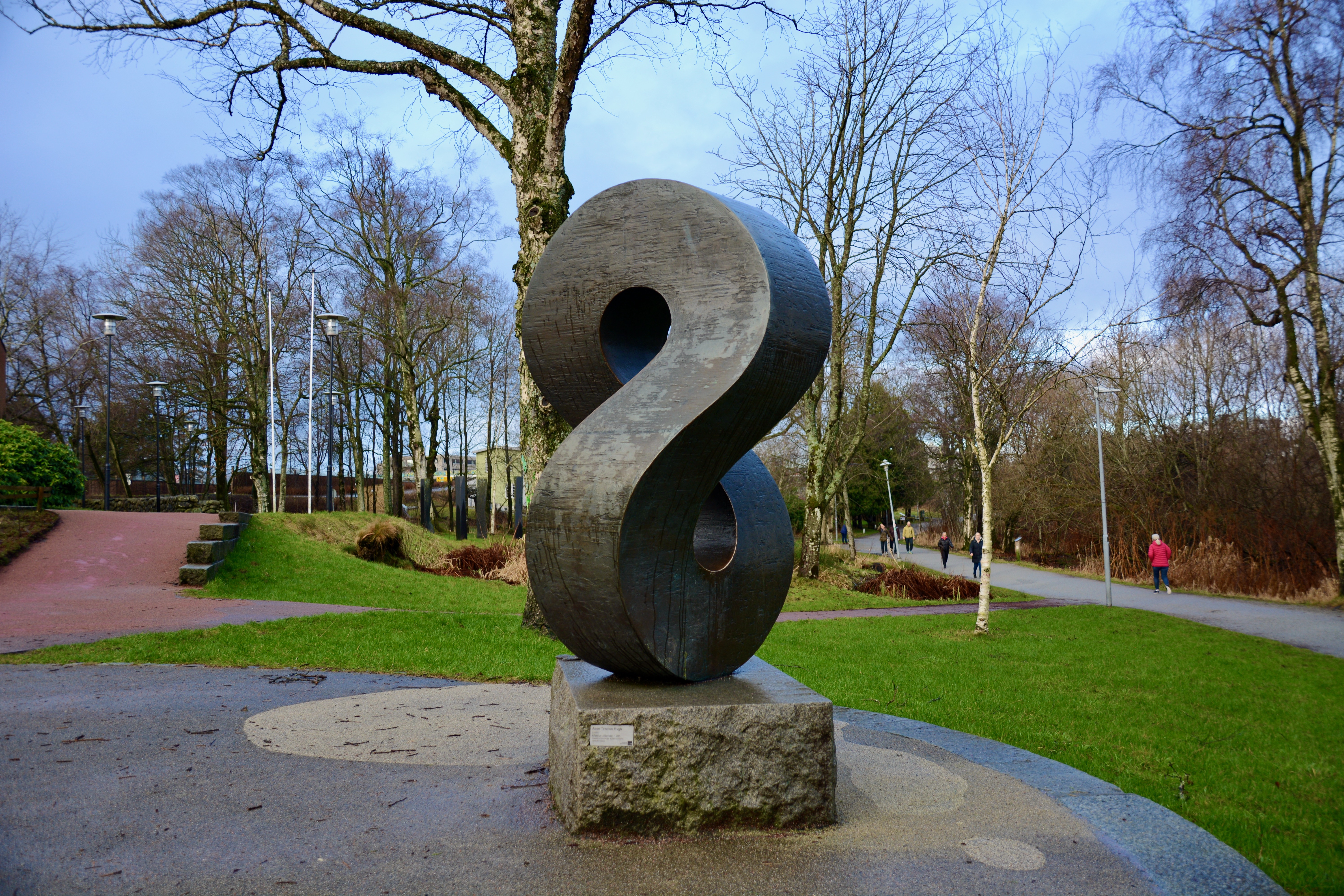 Skulpturen "Møbius" er ikke bare stilig, den har også spesielle matematiske egenskaper. Skulpturen er inspirert av det såkalte “Møbiusbåndet” - oppkalt etter den tyske matematikeren og astronomen August Ferdinand Møbius, som på 1800-tallet laget et bånd med kun én side og kun én kant. Det vil si at man kan følge flaten kontinuerlig fra den ene siden til den andre uten å gå over noen kant. Prøv selv og se ved å la hånden gli over skulpturens overflate!