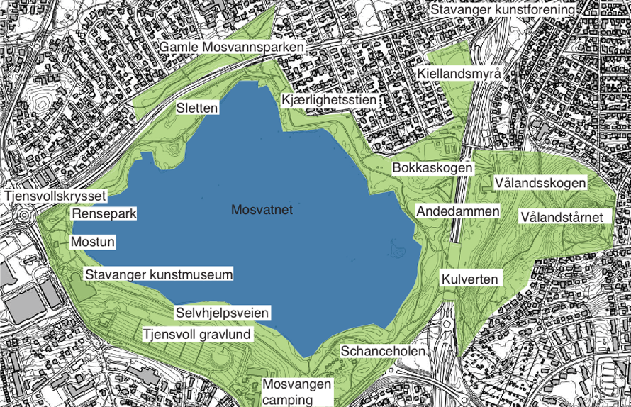 Høyder over havet: Mosvatnet – 37 meter, Vålandshaugen – 83 meter
